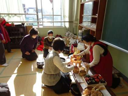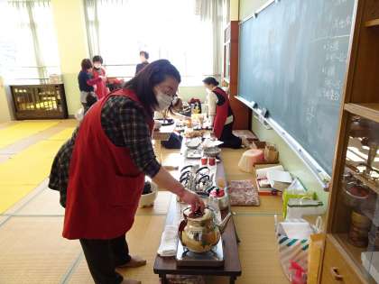 児童が茶道体験を楽しんだあと、実は女性会の方々がお茶道具の後片づけや、次の体験に向けた準備をしてくださっています。授業中だけではみえないところで、女性会のみなさんがたくさんのお仕事をしてくださっていることも知っておいてくださいね。