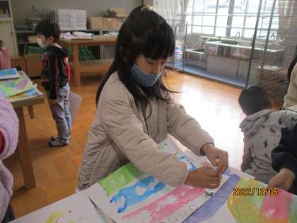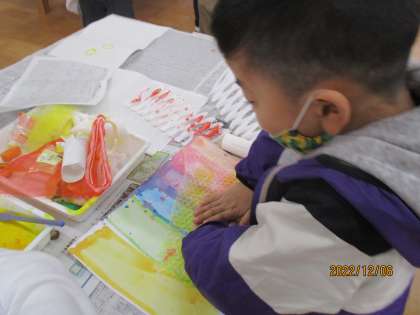 絵具をつけて、ぺったん!!!どんな形が出てくるかわくわくしながら学習に取り組む子どもたち。ぺったんする度に、「うわぁ!!すごい!!」「これ、めっちゃ面白い形!」とつぶやいていました。絵具も大好き!ぺったんも大好き!!とても楽しそうな1時間でした。とても素敵な作品ができました。