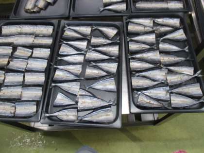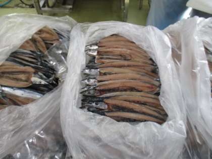 給食室にたくさんの開干しさんまが届きました。まるでさんまの群れのようですね!