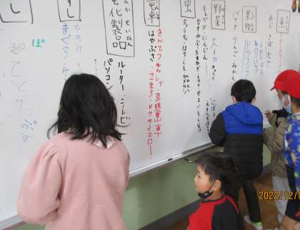 国語で「もののなまえ」を学習しています。「まとめてつけたなまえ」「一つ一つのなまえ」をホワイトボードいっぱいに書きだしました。
