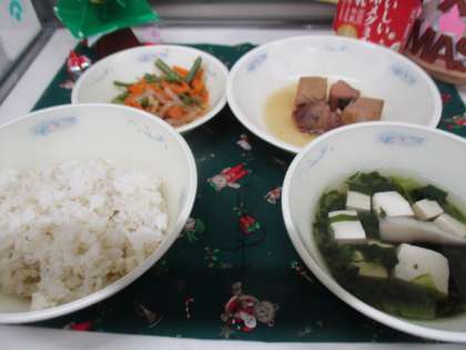 今日の給食は、麦ごはん、牛乳、なま節のしょうが煮、野菜のきんぴら、すまし汁でした。