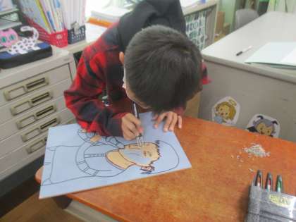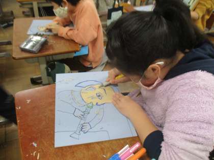 自分の顔を丁寧に彫っていました。顔のしわにそって彫刻刀を彫り進めています。