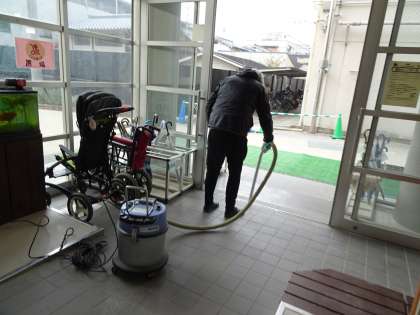 避難訓練の後、児童のみなさんが教室で学習を始めたころ、玄関や廊下・階段では、管理用務員のお二人や校務支援の先生などで、校舎内に入った土をきれいに掃除してくださっていました。給食時間までに廊下や階段が美しくなるよう、手際よく作業をしてくださっていました。ありがとうございます!