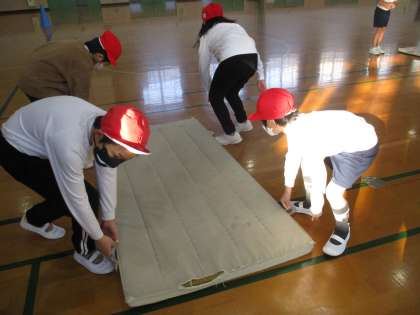 体育のマット運動の様子です。マットを準備するところから始めています。4人で協力して運んでいます。4人で上手に運ぶことができるようになってきました。マットのみみの部分も自分たちで入れています。