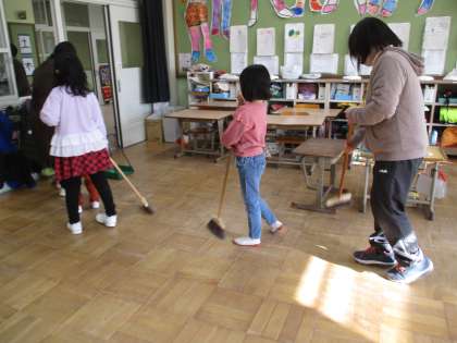 そうじの様子です。一列になってほうき隊がんばっています!