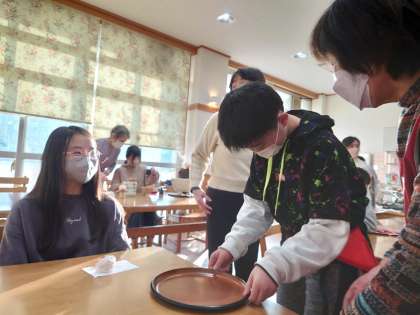 「初釜」とは、新年最初のお茶会です。今日も女性会のみなさんが協力してくださって、お茶を点(た)ててくださいました。茶道部の児童はお運びを体験しました。