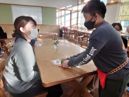 緊張しながらも、女性会の方から教えていただいた通りに、上手にお運びをすることができていました。多くの教職員が、おいしくお茶をいただきました。