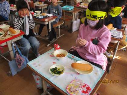 人権学習をしました。盲導犬について知るために「ベルナの目はななえさんの目」を読みました。盲導犬のベルナは,ななえさんがお出かけやお仕事ができるためにたくさん仕事をしてくれていることを知りました。給食の献立はいつも決まった位置におかずやパンが配置されています。それは,目の不自由な人が安心して食べられるためでもあります。自分たちでもタオルで目を覆い,ストローを牛乳パックにさすなどを体験してみました。タオルのご準備ありがとうございました。