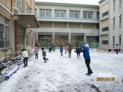 たくさん雪がふったので,みんなで外に出て雪がっせんや雪あそびを楽しみました。担任は手袋がなかったので本気を出せず残念!!とても楽しかったです。