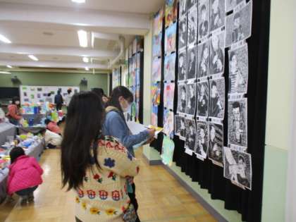 図工展の鑑賞をしています。他の学年にもそれぞれ良さがありますね。