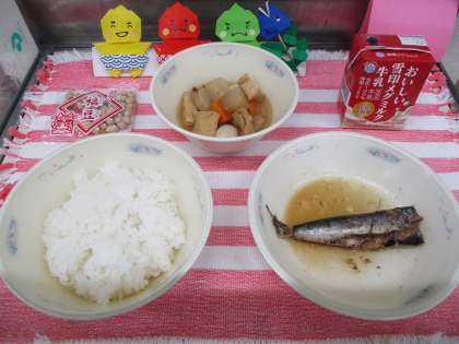 2月3日(金)の献立は、ごはん、牛乳、いわしのしょうが煮、関東煮、いり豆でした。