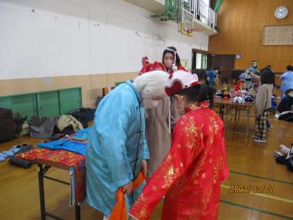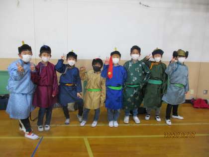 モンゴルの衣装(デール)を一人ずつ着せてもらえました。帽子もかぶってみんな,とっても似合っていました。担任も着せていただくことができ,うれしかったです。ずっと着ているととてもあたたかったです。(写真をとるときだけ,マスクを外しています。)