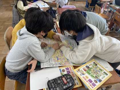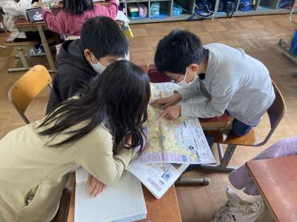 社会の学習で,安全マップを見ながら校区の危険なところを話し合っていました。みんな前のめりになるくらい意欲的に取り組んでいました。