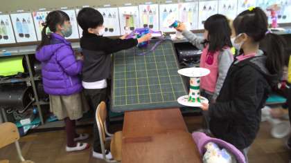 図画工作科「かみざらコロコロ」で作製した作品を実際に転がしました。机をつなげて道を作ったり,紙や板を使って坂道を作ったりしました。子どもたちは自分の作品だけでなく,友だちの作品を見て褒めあう姿も見られました♪