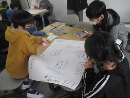 みんなで相談しながら、みんなが楽しめる公園の計画を立てていました。ベンチや遊具をどこに設置をするのかなど、イメージを膨らませながら書いていました。
