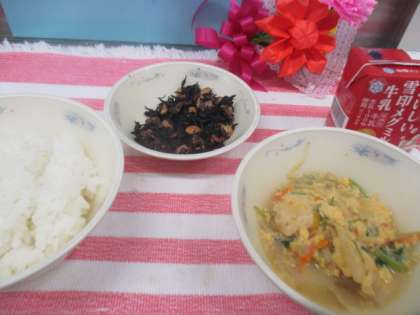 3月15日(水)の給食は、ごはん、牛乳、親子煮、ひじき豆でした。