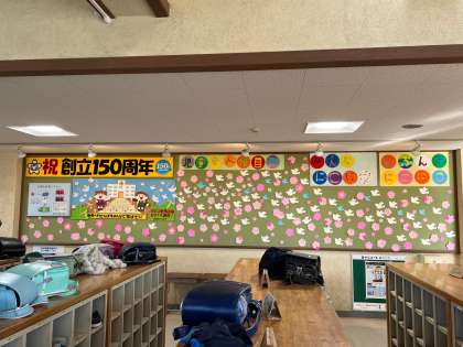 卒業式まであと5日・・・6年生の卒業をお祝いする「おめでとう」の掲示が、校内いろいろなところでみられます。今日は、職員室横と玄関の掲示板も「卒業おめでとう」になりました。