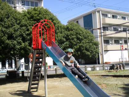 子どもたちに一番人気の遊具は、最近新しくなったばかりという滑り台でしたよ!