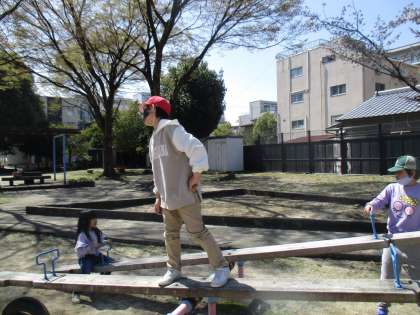 シーソーでは、「シーソーやろう〜!」と友達を誘って乗ることができていました。