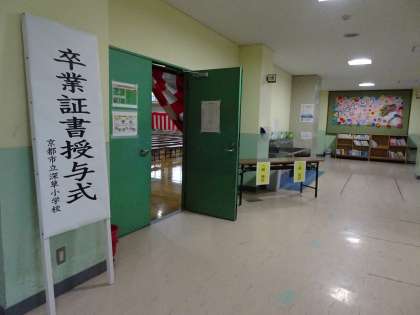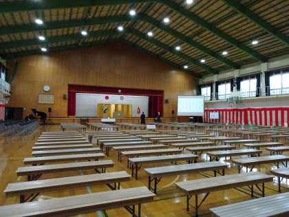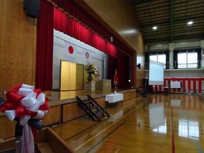会場の体育館をのぞくと、しっかりと準備が整っています。あとは、卒業生の入場を待つのみです。