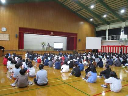 4年生は体育館に入って、5年生と一緒に式に臨みました。