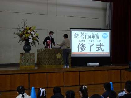 今日で、令和4年度の深草小学校の205日間の授業がすべて終わります。先ほど、代表の5年生に、修了証を渡しました。みなさんにはのちほど、担任の先生から一人一人に3学期の通知票が渡されます。通知票の裏に「修了証」がありますので、みていてください。