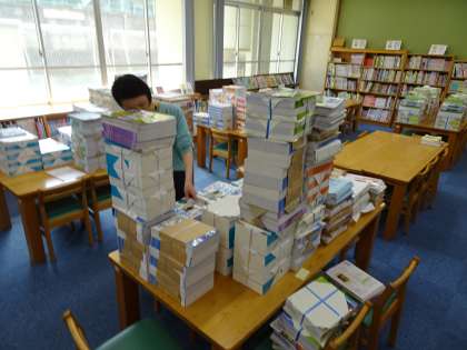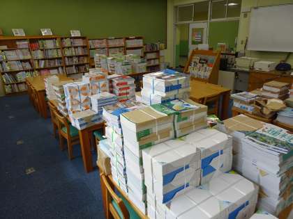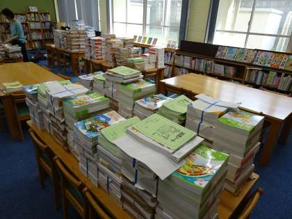 いよいよ、今日から教室での学習が始まりました。第2図書館には、新学期から使用する新しい教科書が準備されています。M井先生が、最後の確認をしてくれていますよ。
