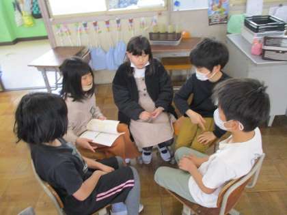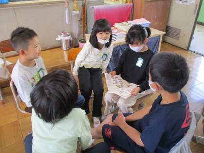 国語の時間に、自分の名前と好きなもの(こと)を言いながら自己紹介をしました。次の人は、隣の人の言ったことを繰り返して自分の紹介をします。はじめは、照れながらでしたが、慣れてくるといきいきと話す姿が見られました。