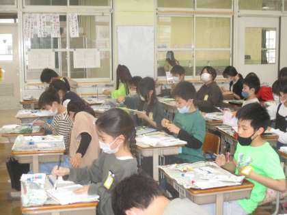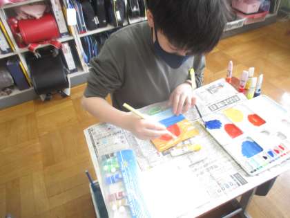 いろいろな空を思い浮かべながら,描いていきました。水の量を調節しながら、色の濃淡をつけていました。