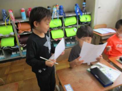 「あつまってはなそう」では動物ビンゴをしました。動物の絵を描いた後、友だちのところに行って「わたしはねこがすきです。」などとおはなしします。「あなたのすきな動物は何ですか。」と上手に話をしていました。