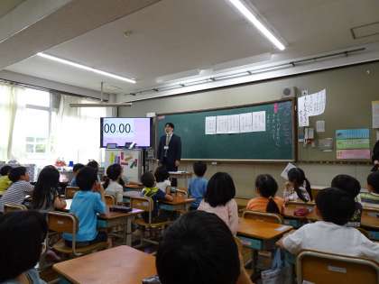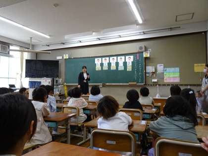 1年生は、国語「うたに あわせて あいうえお」の学習をしています。先生の口の形をまねして、みんな口の形に気を付けて、音読していますよ。
