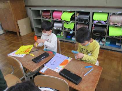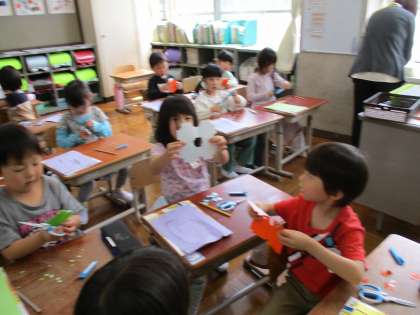 今度は折り紙を折っていろんな切り方をしてみました。広げてみたら「うわあ〜!」「見て見てこんなのできた〜!!」といろんな声が聞こえてきました。みんな素敵な飾りができましたね♪