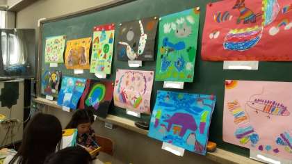 「ふしぎなたまご」の鑑賞会をしました。友達の作品の上手なところ、マネしたいところをシートに書きました。「○○さんの色のぬり方がとてもきれいだった。」「○○さんのアイディアがとても楽しいなあと思った。」などと、感想を伝え合っていました。