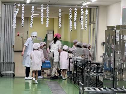 4時間目がおわると、給食の時間が始まります。1年生の給食当番が、ほかの学年より少し早く給食室に来ました。