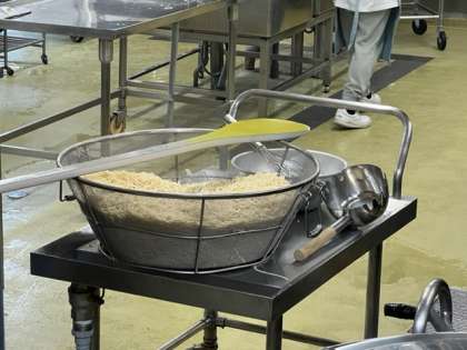 給食室をのぞいてみると・・・あれ?今日の献立の「きつねカレーうどん」の麺がザルの中に。。。