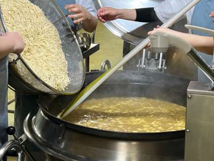 給食調理員さんは、子どもたちに、「少しでも出来立てを食べてほしい!」という思いで、給食当番が取りに来る時間を計算して、時間ギリギリまで調理するのを待ってくれているのです。給食当番が取りに来る直前に麺を鍋に入れ、手際よく調理します。もちろん、給食当番が取りに来た時には、おいしい“きつねカレーうどん”が完成していました。調理員さん、さすがです!!!