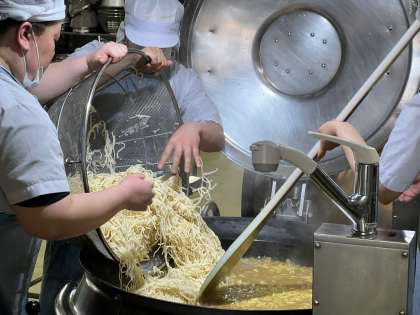 1年生の給食当番が給食室に来ているのに、調理場をのぞいてみると、カレーうどんの麺がザルの中に・・・でも、決して給食調理員さんが調理し忘れているわけではありません。