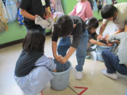 雑巾のしぼり方を6年生に教えてもらっいました。水がたれないようにしっかりしぼるようになってきました。「そうじ、すき!」と言って楽しんでしています。きれいになると、気持ちがいいですね。
