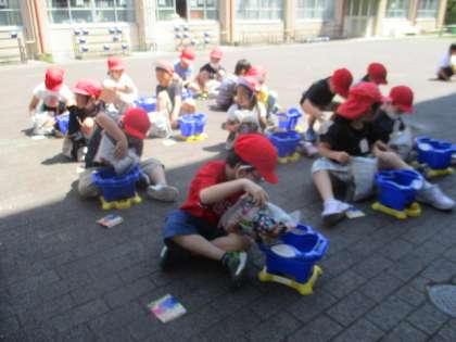 あさがおの種を植えました。土と肥料を混ぜました。指で開けた穴に丁寧に1個ずつ種をつまんで入れてやさしく土をかぶせていました。1年生のみなさん、登校したら水やりをお願いしますね!