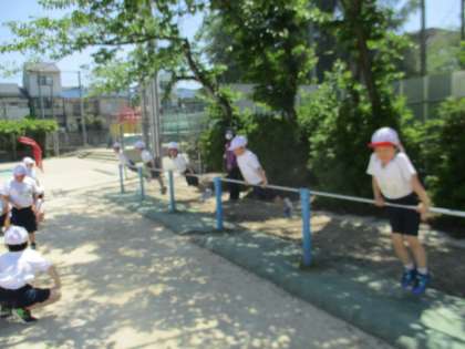 体育の鉄棒あそびの様子です。つばめや前回りなどをしました。はじめはこわがっていた子も、少し補助をするとできてとても嬉しそうな顔を見せてくれました。