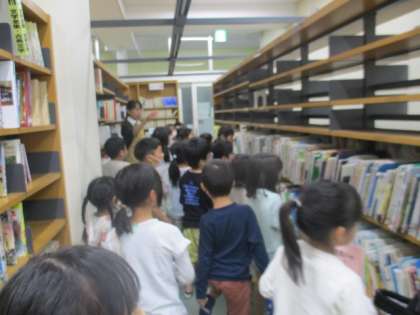 司書の先生に図書館の使い方や本の借り方をおしえてもらいました。本の扱い方についてのクイズがあり、「汚れた手で本を触ったら、本がかわいそうだよ。」とつぶやいていた子もいました。この後、初めて本を借りました。たくさんの本に出会い、好きな本が増えるといいですね。