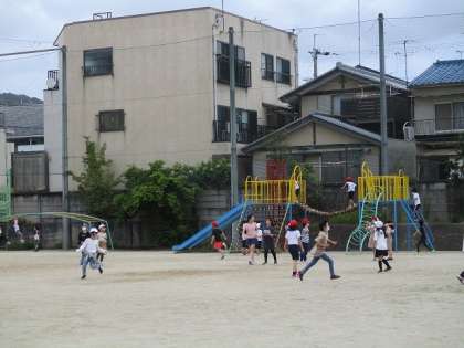 今日は雨上がりの気持ちのいいお天気の中、運動場でみんな遊びをしました。ふえおには、子どもたちの人気のおにごっこです。