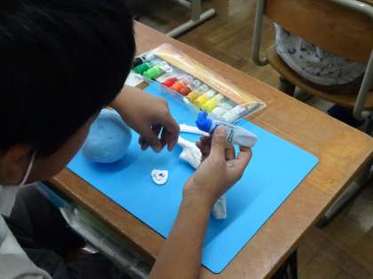 4年生が、ねん土の色や形を考えながら「元気のおまもり」を作っています。ねん土をまるめたり、のばしたり、色を付けたり・・・一人一人工夫しながら、いろいろためしています。さすが4年生!!集中して、楽しみながら学習できています。