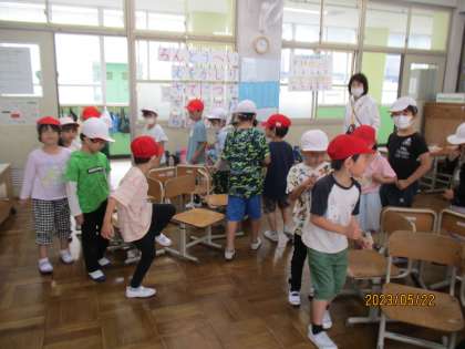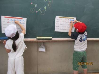 算数で「いくつといくつ」の学習に入りました。3つのグループに分かれ,そのグループの中で赤チームと青チームに分かれて「いすとりゲーム」をしました。いすの数は6脚で変えずに,5回ゲームを行ってどちらのチームの人がたくさん座れたかを競いました。これからの学習で記録係の子が塗ってくれた帽子の色の数を見たり,数図ブロックを見たりして,6をいくつといくつに分けられるかを学習していきます。
