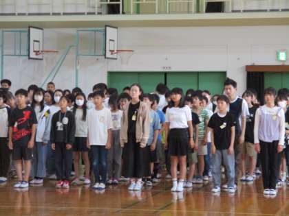 お迎え集会本番に向けて,学年練習を行いました。本番に向けての練習は「2回」だけです。影での努力の成果が出て,何とか「名探偵フカンくん!の劇」と「believe合唱」それも二部合唱!!が仕上がりました。さすが6年生です。本番も頑張りましょう!