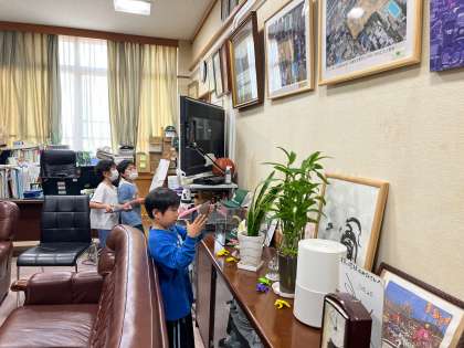 1年生がタブレットを手にがっこうたんけんをしています。校長室にも来てくれました。学校の中でお気に入りの場所を撮影しているようです。うまくとれたかな?