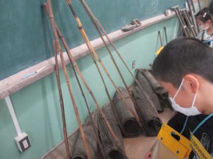 総合的な学習では、「昔の竹の道具」を調べました。調べるだけでなく、職員室前や資料室に行って学校の中にあるものを実際に見てみました。