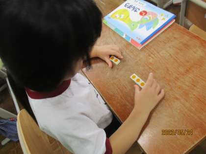 算数で「いくつといくつ」の学習を進めています。この日はいすとりゲームの結果をヒントにしながら,ブロックを使って「6はいくつといくつに分けられるか」を考えました。
