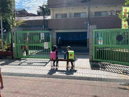 下校時、正門には車止めを設置しています。本町通に児童が飛び出さないための工夫の一つです。