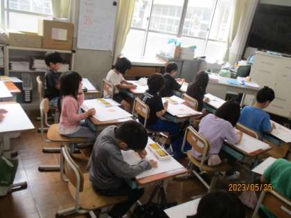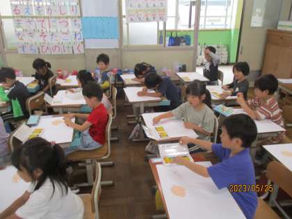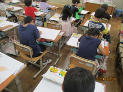 図工で「みてみてあのね」という学習をしました。休みの日にして楽しかったことや学校でして楽しかったことをクレパスを使って絵に表しました。まずは「うすだいだい色」を使って顔の色を塗りました。
